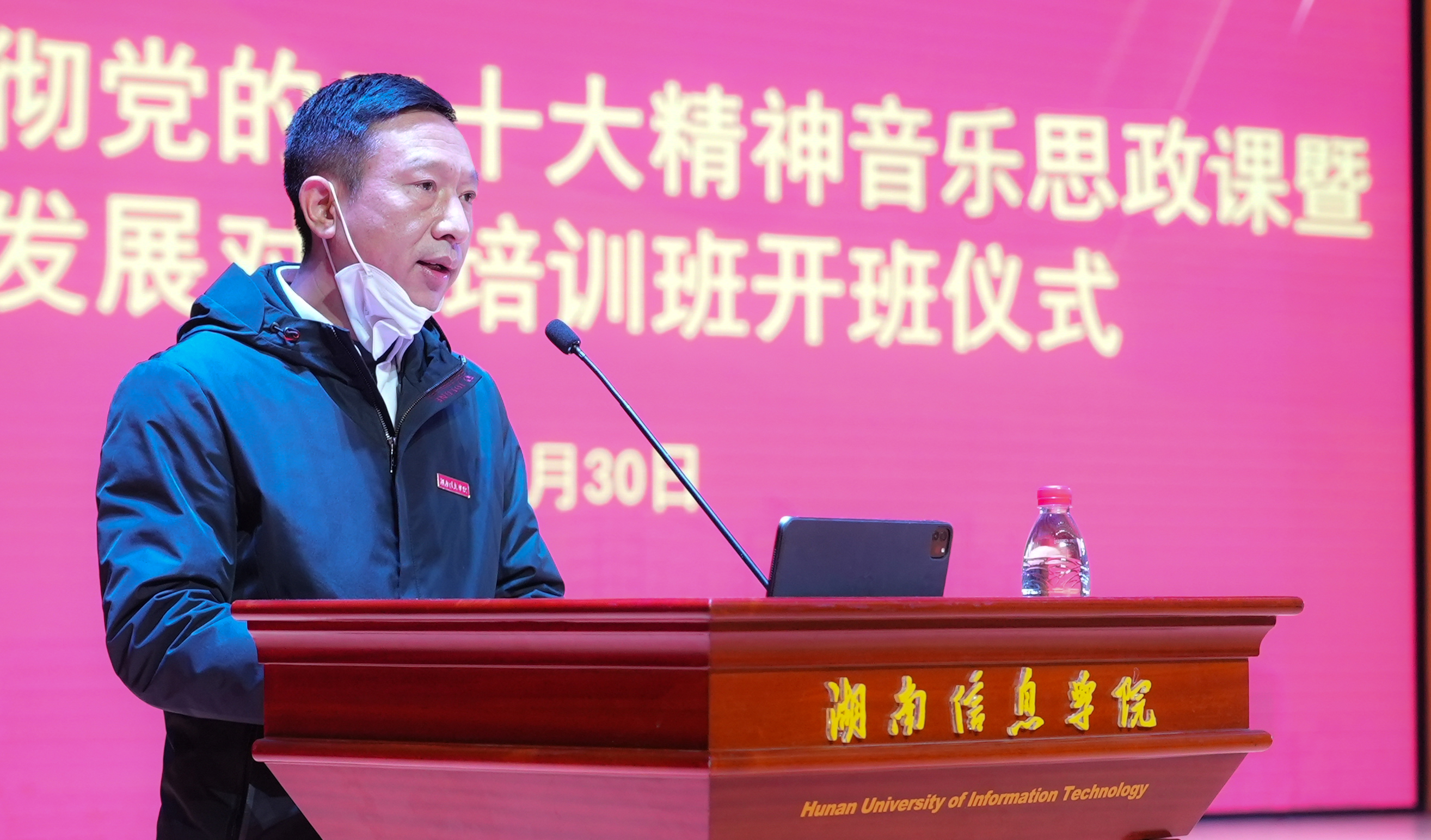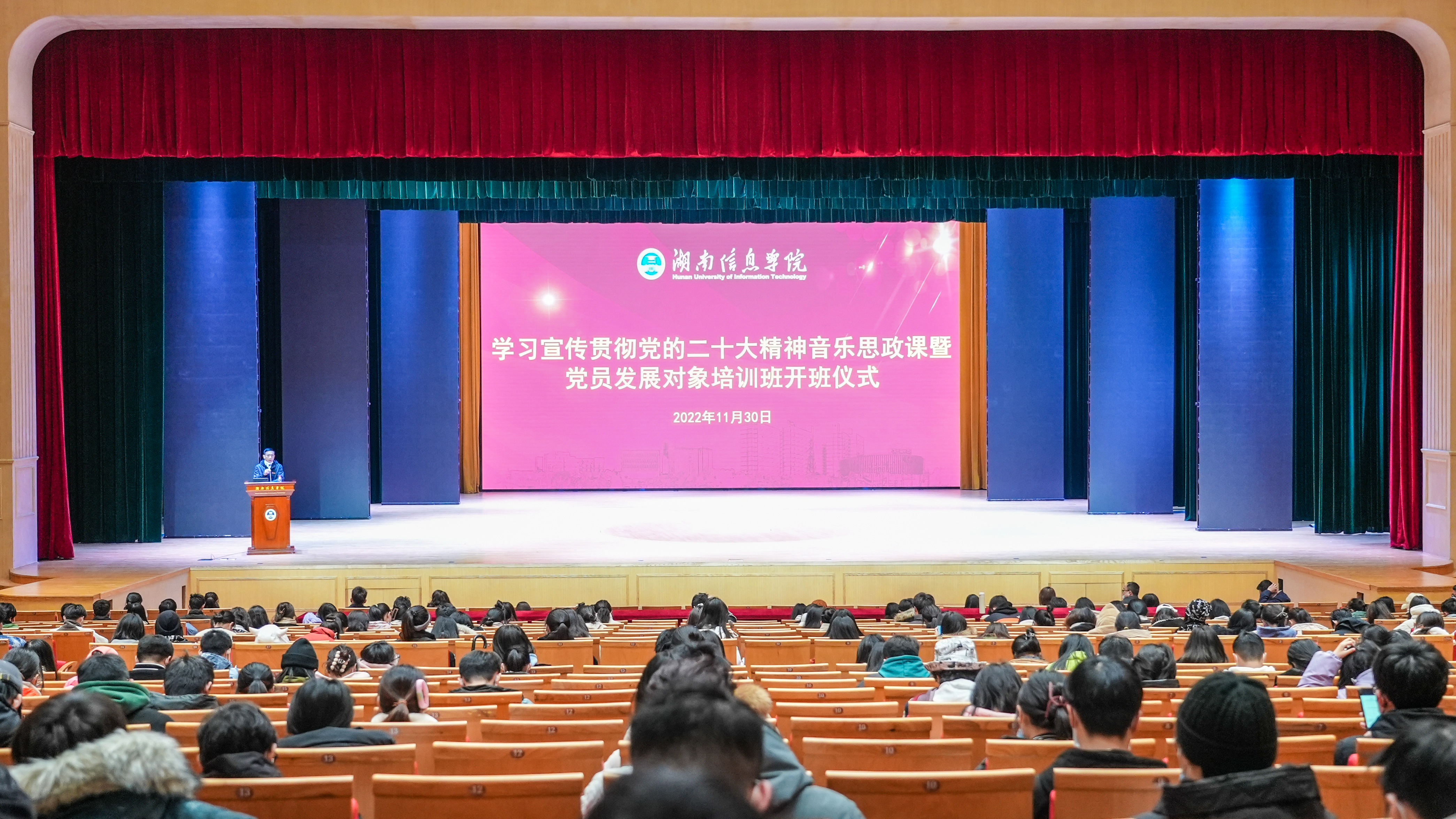 唱响主旋律,壮大正能量。11月30日晚,“学习贯彻党的二十大精神”音乐思政课暨发展对象培训班开班仪式在学校举办。本次音乐思政课由校党委特邀湖南广播传媒有限公司党委委员、副总经理、中国新闻奖一等奖获得者钟启华主讲,学校党委委员、党委工作部部长黄涛主持。学校二级学院党总支书记、副书记、全体 43 期入党积极分子、2022 年下半年发展对象共同聆听。